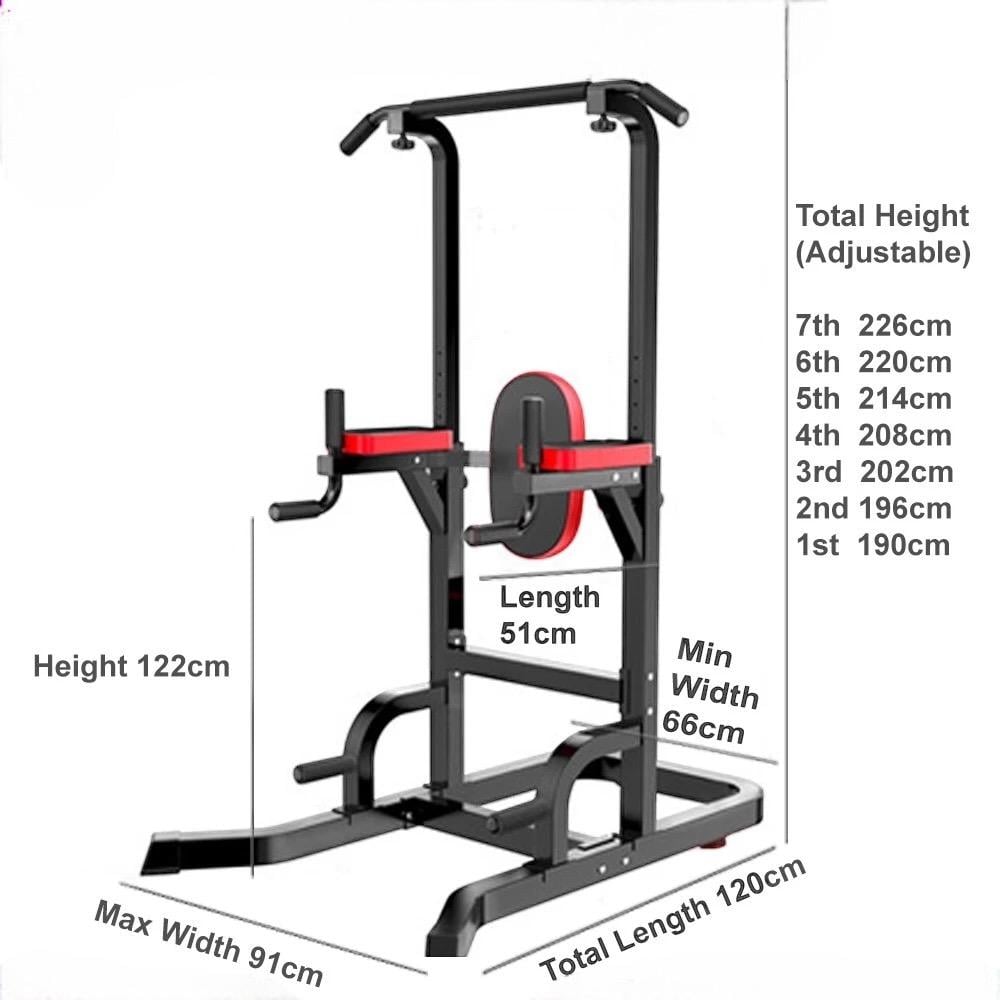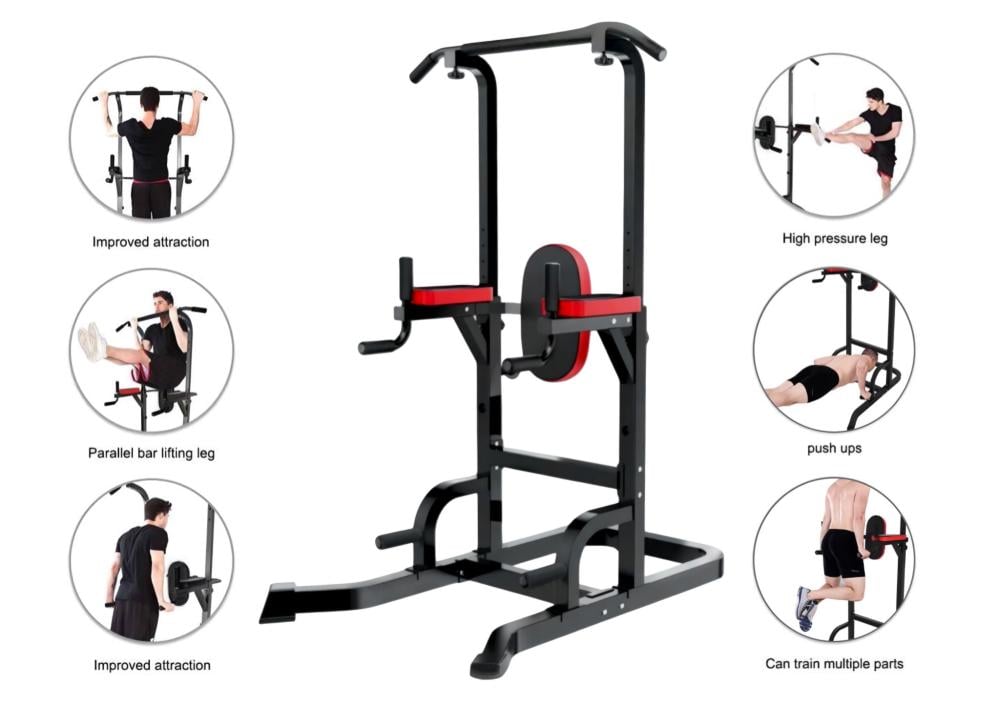 • يوفر الجهاز تمارين متنوعة تشمل: العقلة، المتوازي، رفع الركبة، تمارين البطن، والصدر والكتفين.